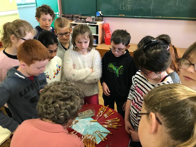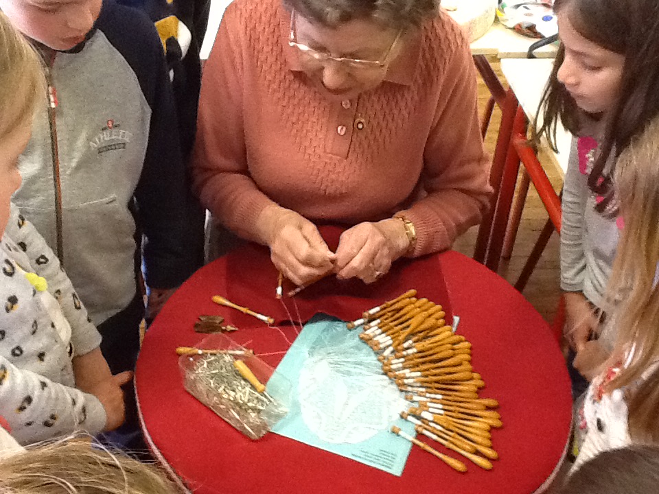 Vendredi 5 avril, les élèves de l'école ont admiré le savoir-faire de Thérèse qui réalise de la dentelle au fuseau, à plat ou en volume. C'est à l'âge de vingt ans qu'elle découvre cet art en se disant qu'un jour elle saurait faire. Depuis une douzaine d'années, c'est une véritable passion pour elle ! Assise devant un coussin, elle manipule une trentaine de fuseaux en bois recouverts de fil et effectue 5 cm2 à l'heure. Face à l'envie de certains d'entre nous d'essayer, elle reviendra avec du matériel adapté aux grands de l'école.